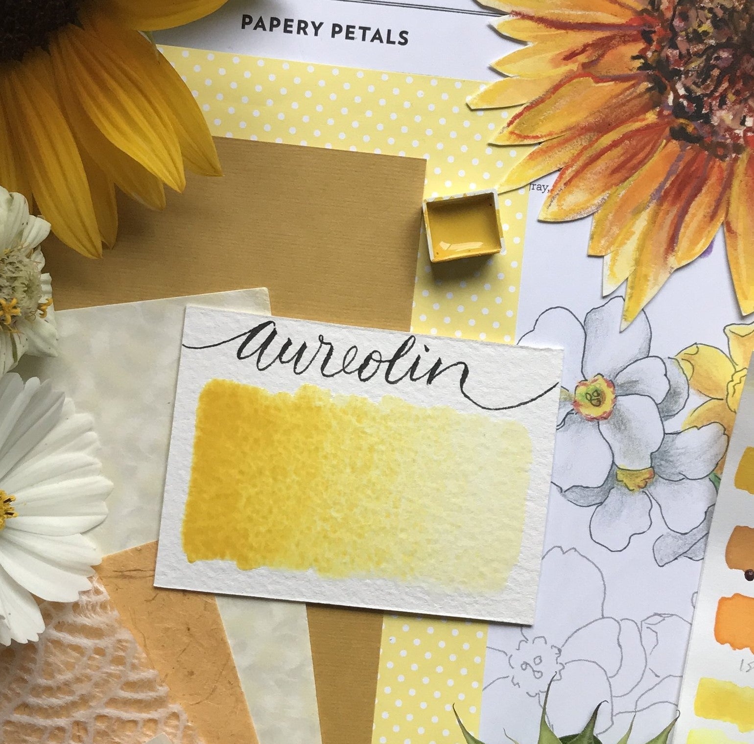 Aureolin is a relatively neutral primary yellow that is useful for colour mixing and glazing applications in watercolour. This is a colour that is particularly valued for its transparency and is often used to give the impression of a warm glow within floral and landscape paintings. Aureolin is a bright, dandelion yellow that is more transparent and slightly more granular than Hansa Yellow.
