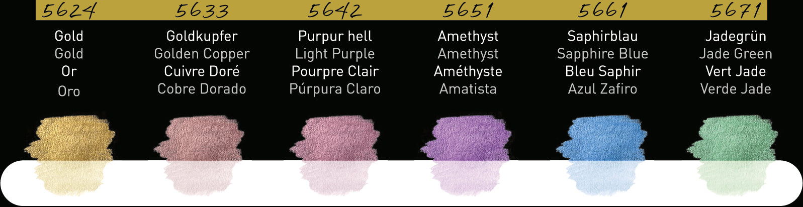 These iridescent colors are handcrafted in Germany and dissolve with water and a brush, just like traditional watercolors. Lightfast and pigment-rich, these ccolors are exceedingly brilliant on dark surfaces. They work well with brushes and dip pens; simply brush the color onto a nib to use it as calligraphy ink. Colors included: