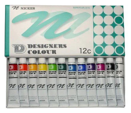 The 12 Color set contains 20ml tubes of the following colors: 501 Chrome Yellow, 509 Mandarin Orange, 527 Magenta, 530 Royal Purple, 537 Cobalt Blue, 543 Cerulean Blue, 547 Viridian, 554 Lawn Green, 557 White, and 560 Black.