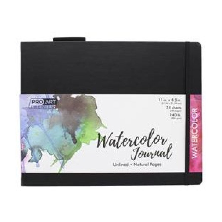 Pro Art Premier Watercolor Journal, 8.5"x 11" landscape profile. Natural 140# Cold Press 24sht- Features quality 140lb/300gsm cold pressed paper that resists warping and bleeding. Acid free paper is sewn bound in 6 landscape signatures that allow the book to lay flat when open. Easily elongate your design from edge-to-edge across the two page spread without any wasted margins.