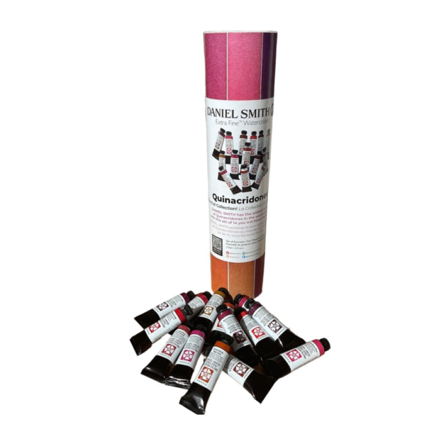 DANIEL SMITH has the widest range of Quinacridones in the world – now you can collect all 14 colors in one fabulous set of 15ml tubes. With a range of staining properties, along with vivid luminosity and beautiful transparency, they’re perfect for glazing, layering and blending without losing a drop of brilliance when dry. You’ll love working with their extremely smooth washes, incredible depth and clarity, plus an endless array of color combinations.