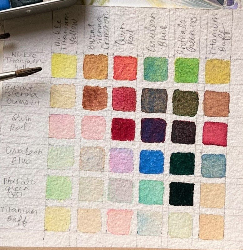 Artist’s Notes: Mix Titanium Buff, Cerulean Blue, and Phthalo Green Yellow Shade for a variety of vivid spring greens. Quinacridone Red and Nickel Titanium Yellow create a range of oranges perfect for botanicals and florals. Use Burnt Sienna Crimson to add shadows into greens and for added warmth, or combine it with Nickel Titanium Yellow for a pretty colour reminiscent of the original Naples Yellow.