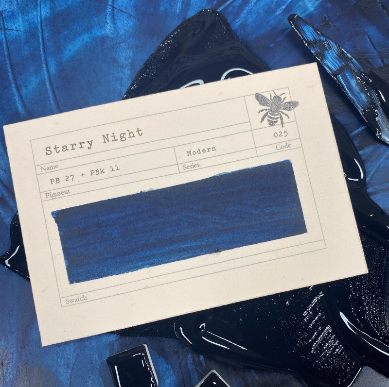 Paint Makers Notes: Starry Night is a combination of Prussian Blue (PB 27) + Iron Oxide Black (PBk 11)