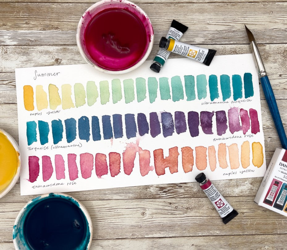 Bask in the warm, glowing colors of summer. The luminous Quinacridone Rose and breezy Ultramarine Turquoise balance beautifully with creamy Naples Yellow, capturing the essence of sun-drenched days, tropical waters, and carefree summer sunshine.